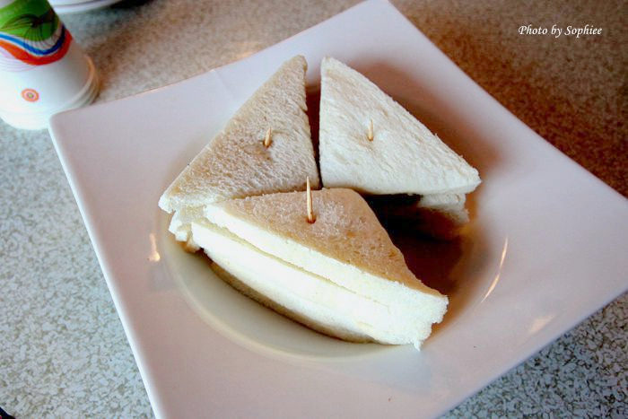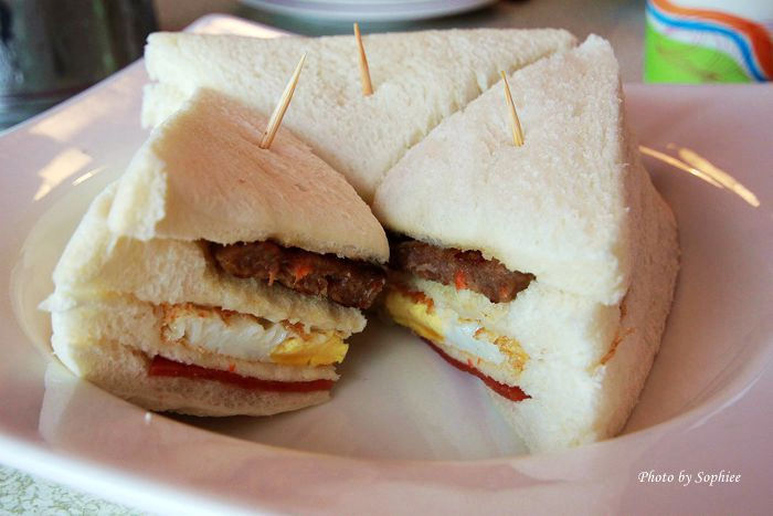 西式早餐則是三明治,裡面包了荷包蛋、漢堡肉、小黃瓜和火腿。