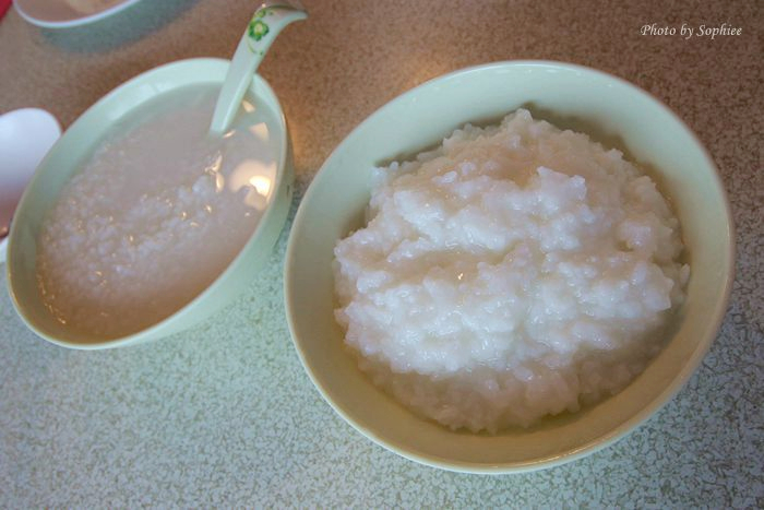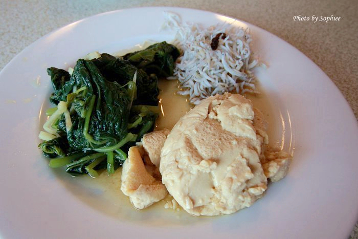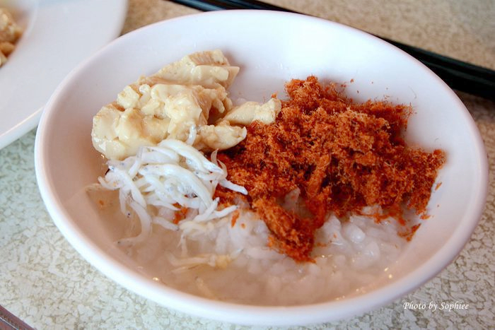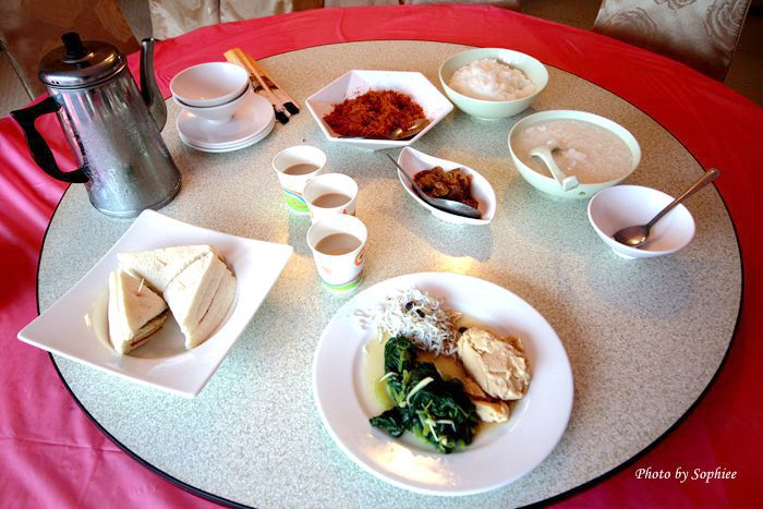 中式早餐是清粥小菜,菜色有炒吻仔魚、蒸蛋及一樣青菜,還有花生麵筋和肉鬆。