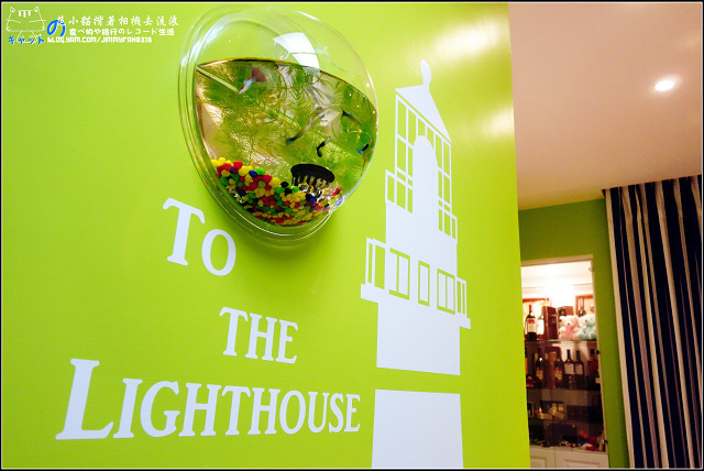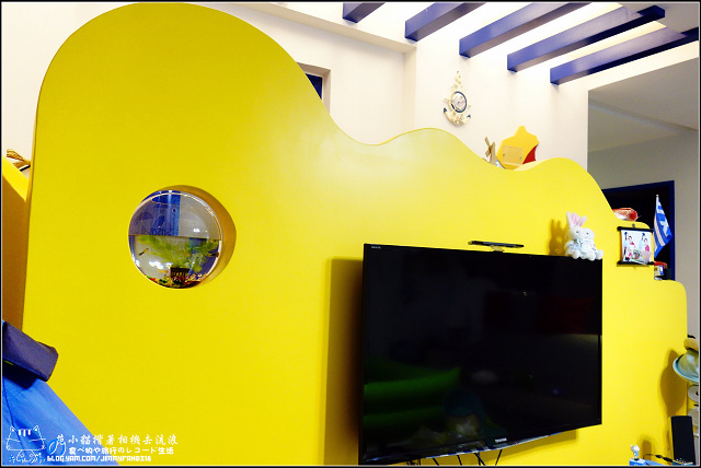 這次換到廚房旁的壁貼牆面,燈塔的壁貼和偽月亮般的弧形魚缸還滿搭的