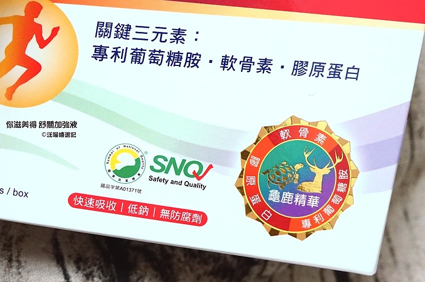 你滋美得舒關加強液龜鹿升級版含有關鍵三元素:專利葡萄糖胺,軟骨素,膠原蛋白,
