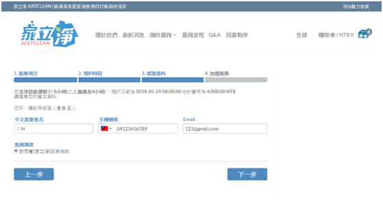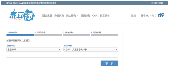 首先選擇服務項目,小in這次是居家清掃,清潔時數8小時(二人服務各4小時)。