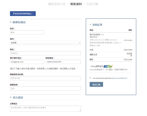 再來填寫預約人基本資料,包括姓名、電話、e-mail。