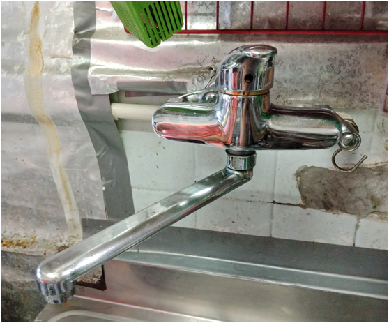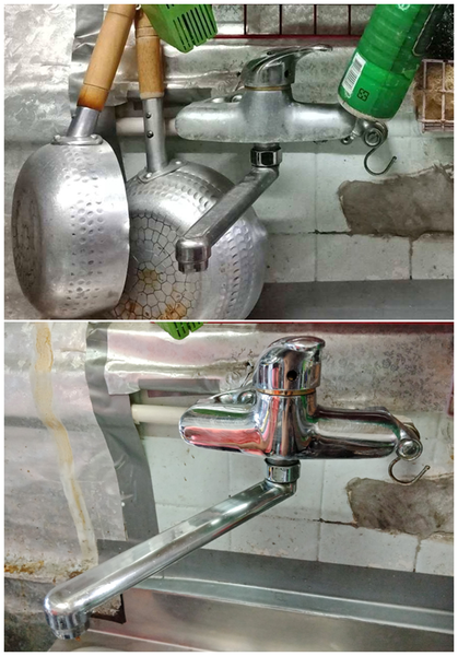 水龍頭我們平常會清理它,大部分是用水潑一潑啦,偶爾會用菜瓜布輕刷,雖然看起來霧霧的,但我們都覺得它應該已經算乾淨狀態了吧。(自以為有清理就乾淨:P)