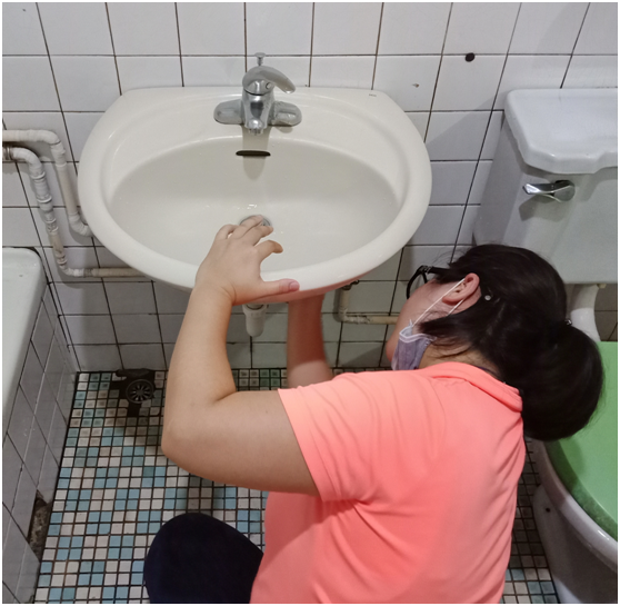 接著來看廁所的部分,開始打掃前任小姐和小in說「馬桶上方的櫃子是木頭櫃,沒辦法使用清潔劑,只能用擦拭的,這樣可以嗎?」、「我可能需要把廁所的東西全部暫時移出去,可以嗎?」、「這個好像乾掉了,妳看看要留著還是要丟掉?」