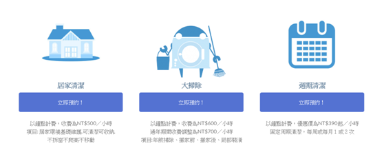 家立淨的服務項目有居家清潔、大掃除和週期清潔,價格透明化,官網都寫得很清楚,每小時390元起。