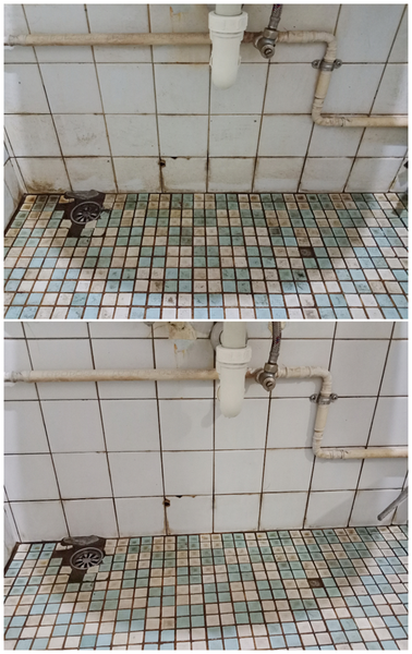 地板是真的比較難救,無法完全刷乾淨,但已經好很多了,排水孔上方的牆壁也變白了。