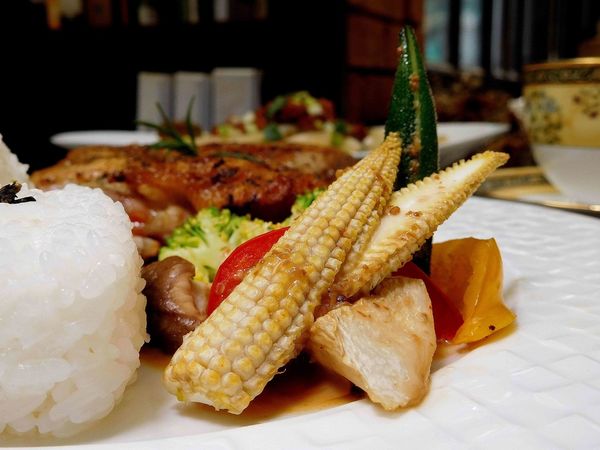 雞腿排先乾煎再以烤箱低溫烤 ,蔬菜也是低溫烘烤 ,蔬菜會隨著季節更換最適合的!!