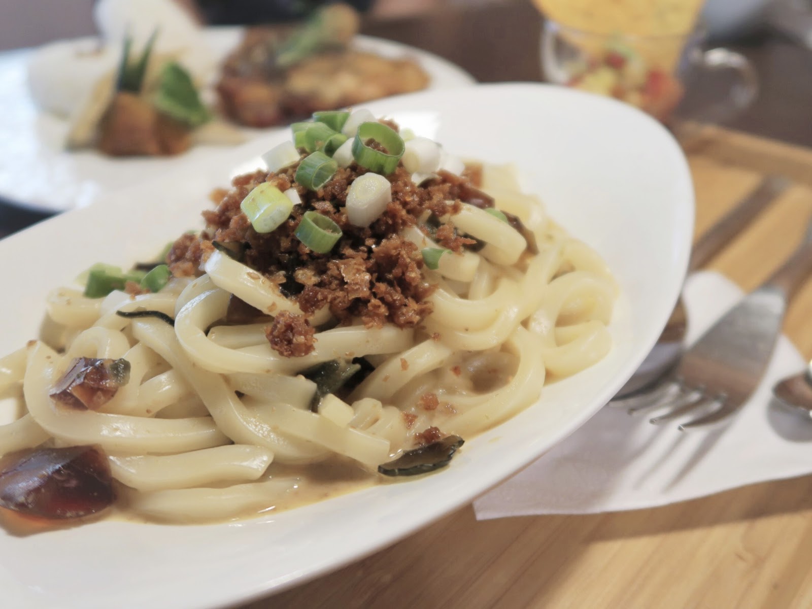 胡麻黑拌麵上面鋪上敲碎的老油條提升視覺效果,酥脆口感搭配Q彈麵條,吃進去的口感相當豐富。老油條的香氣、皮蛋與店家特調獨門醬汁,創造出濃郁創新的感受,吃完口中留有老油條的香氣,令人魂牽夢縈!