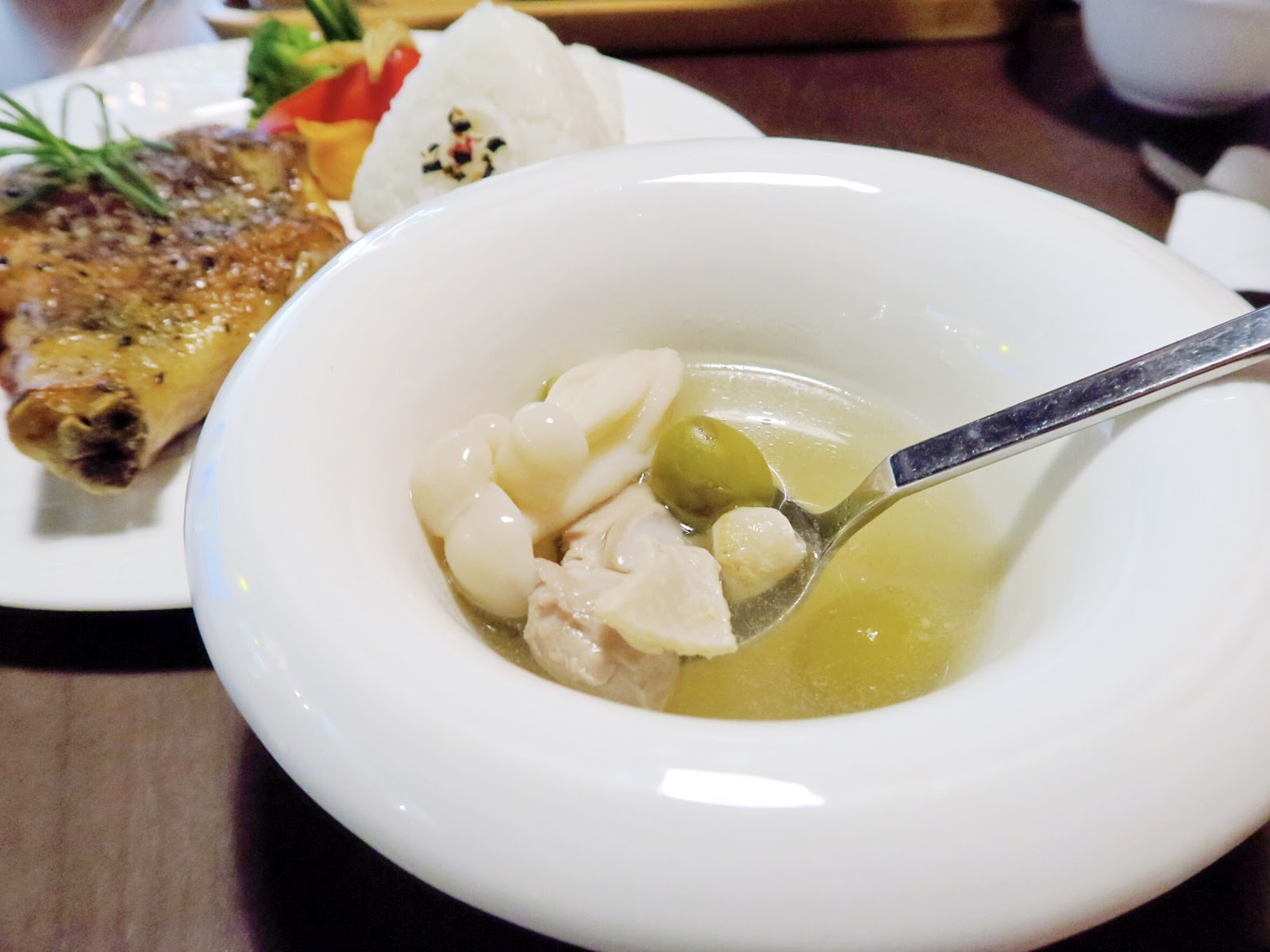 經典餐點附贈的鯷魚橄欖雞湯,烹煮時,鯷魚精華融化在湯裡,來自塞爾維亞的橄欖,微酸滋味融入雞湯之中,口味略像酸菜湯頭,除能襯托雞肉的鮮甜味,更能提升湯品的口感層次,微酸的感受,在夏日品嚐享用,相當開胃!