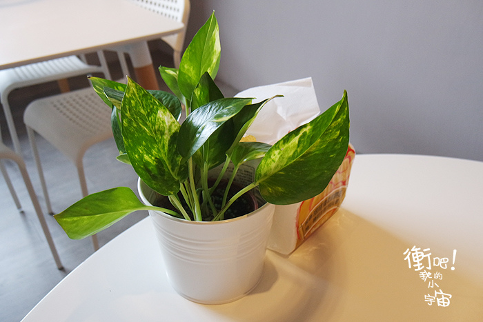 每張桌子上都有一盆黃金葛,綠意盎然的盆栽點綴店內的每個小角落