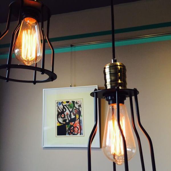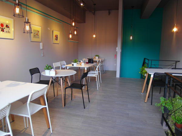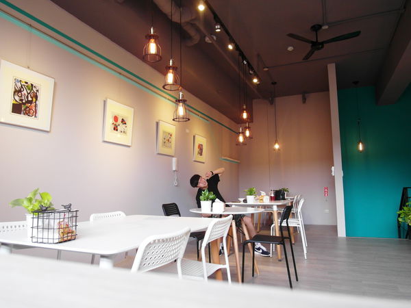 牆上還擺放了幾幅抽象畫作品! 配上懸掛式的燈座真的好悠閒又好美的環境ㄛ