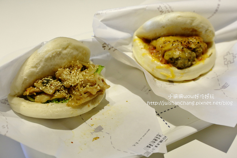 口感跟一般的刈包不一樣喔! 她們的刈包是“生菜”鋪底,不會油膩很清爽,尤其是招牌“泡菜豚肉”刈包,很入味喔! 除了泡菜豚肉,另外還有“法式香腸“、“炸鱈魚”口味呢!