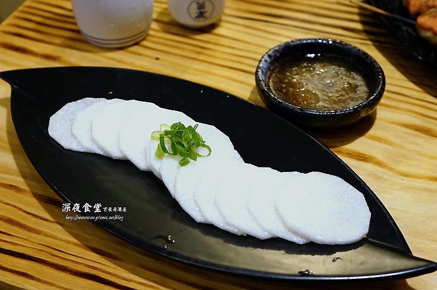 日本山藥切片擺盤,附上加了蘿蔔泥的醬汁,