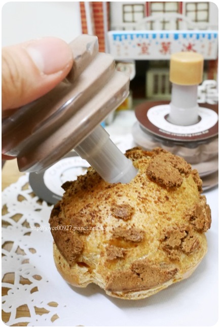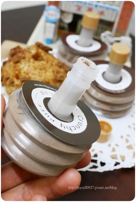 轉開瓶蓋將內餡注入經高溫烘烤後覆以低溫烘培