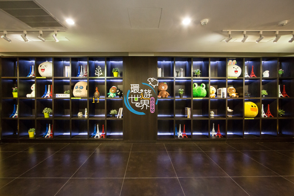 一整面的書架,擺放著LINE家族與書籍、巴黎鐵塔等。