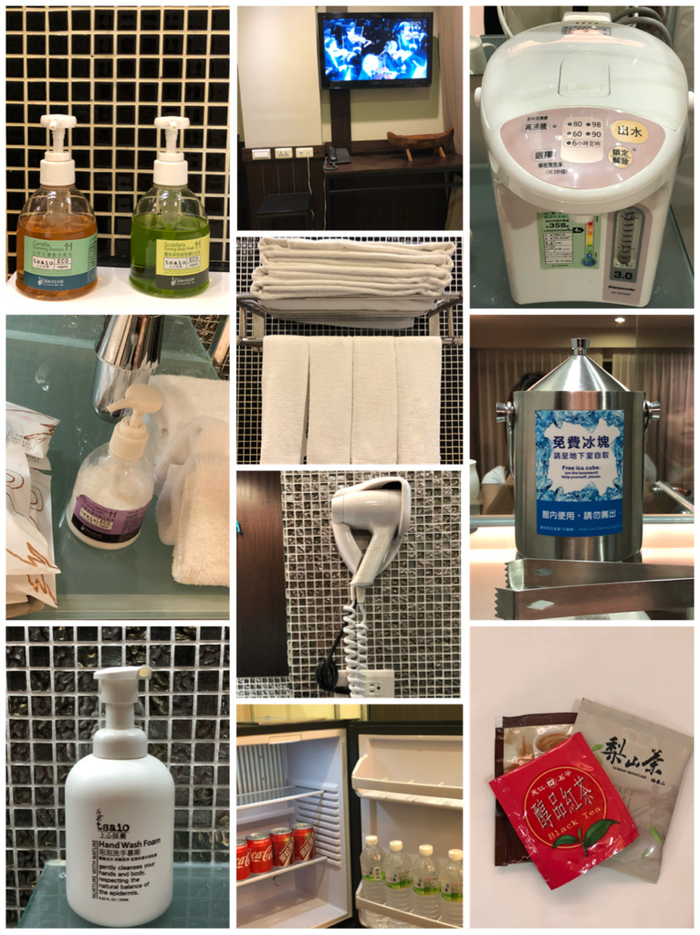 房間約10-11坪,基本配備如圖,熱水壺、咖啡包、茶包、飲料、礦泉水、沐浴用品、免費冰塊等。
