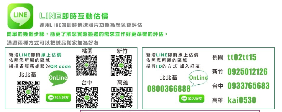依照區域與於務人員做聯繫免費評估搬家費用,線上就能立刻確定搬家程序!!!