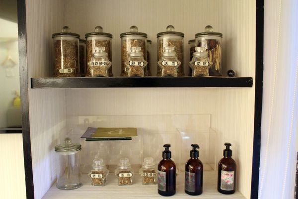 頸枕內放有草藥,草藥也一罐罐展示在櫃上,綜合了消除疲勞、舒筋、活血、助眠的功效,雖然只按腳,上半身也能有放鬆感。