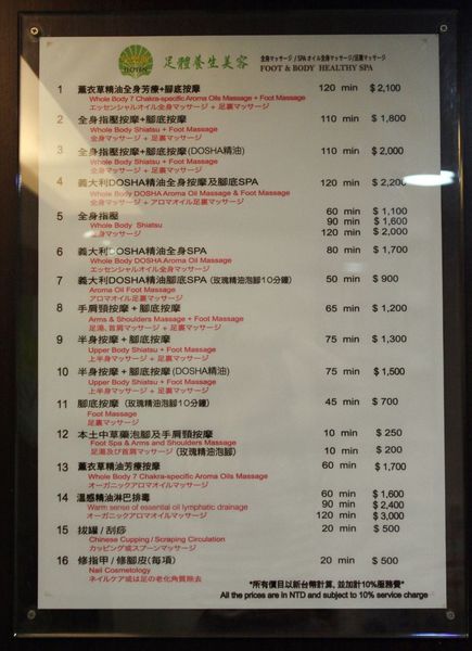 服務項目有腳底按摩、半身按摩、全身指壓、全身精油按摩、做臉等等,價位表清楚標示在櫃檯處。