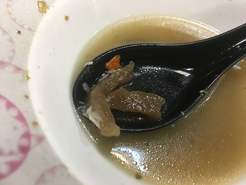 可以看到菜脯雞的湯頭很清澈~上面有一些些的浮油~還有些蒜仁再漂浮著