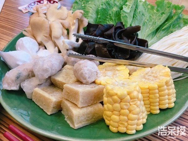套餐的菜盤也上了,蔬菜種類滿多的,有秀珍菇、金針菇、豆腐、玉米、木耳、肉丸(鴨肉小丸子/鴨肉小菲力)、水晶餃、還有綠色蔬菜。