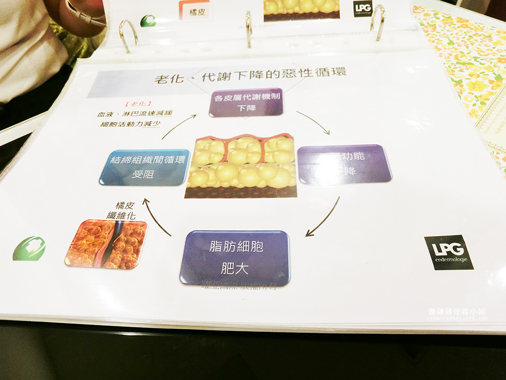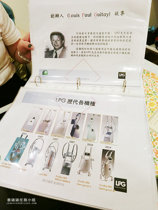 我覺得這個諮詢教學最特別的地方是可以看到LPG的歷史,居然LPG就是來自於創辦人的名字第一個字母組成的,目前LPG的機器已經到了第10代,這一代的按摩器除了原本有的滾輪以外,更把另外一邊的滾輪太代為像是葉片形狀的撥板,它的功用就是模擬人類的手,用非常有效率的按摩"手法",取代人工手法的不足,大大提升效率。