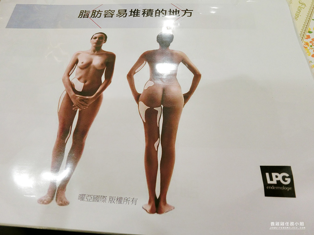 人類脂肪容易堆積的地方好多,特別是那些運動不太到的部位,像是腰腹、大腿兩側、臀部、腹部...等,Jennifer更是每個都有中 8-O