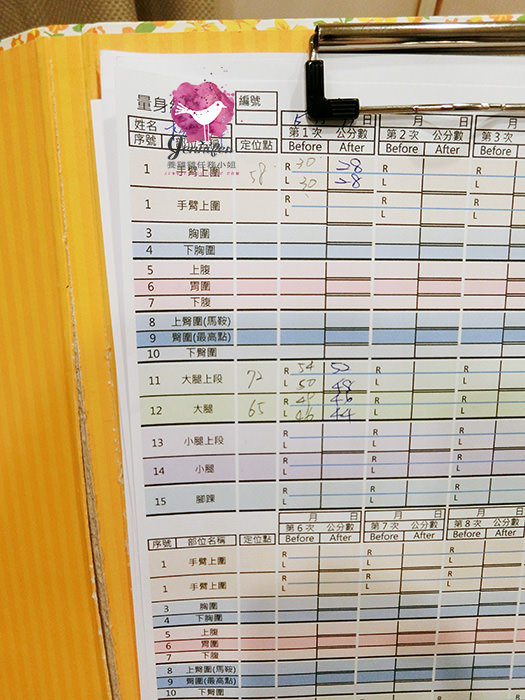 就在歡樂的聊天下,三個部位共60分鐘一下子就過去了,再來測量一下這三個部位的粗度,每個部位都降了最少2公分耶!美體師也很喜歡這樣的成果,讓我好開心喔!