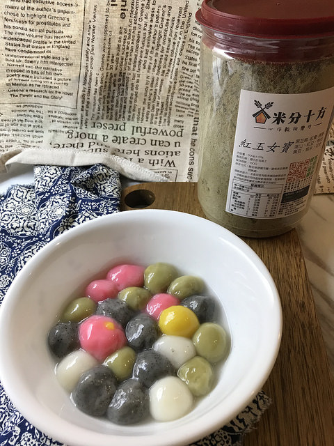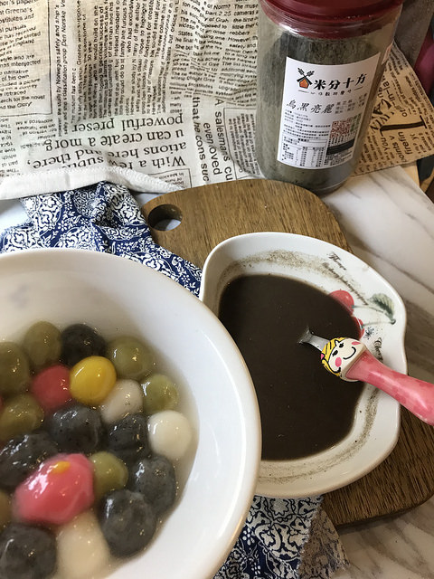 或是有時候晚上肚子餓,乾脆就煮幾顆湯圓放在這烏黑亮麗五穀粉裡面,
