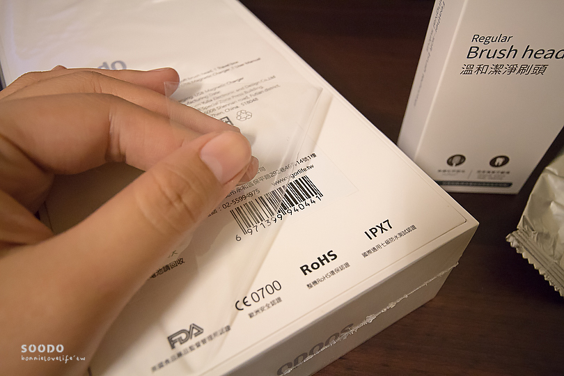 牙刷主體和隨身攜帶盒下有透明膜可以讓你方便拿起,這邊想建議廠商不要貼在實體上面,撕下後的殘膠真的很破壞原本商品美好的質感,可以改用原本最上方放置的霧面膜那樣。