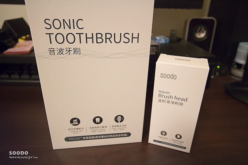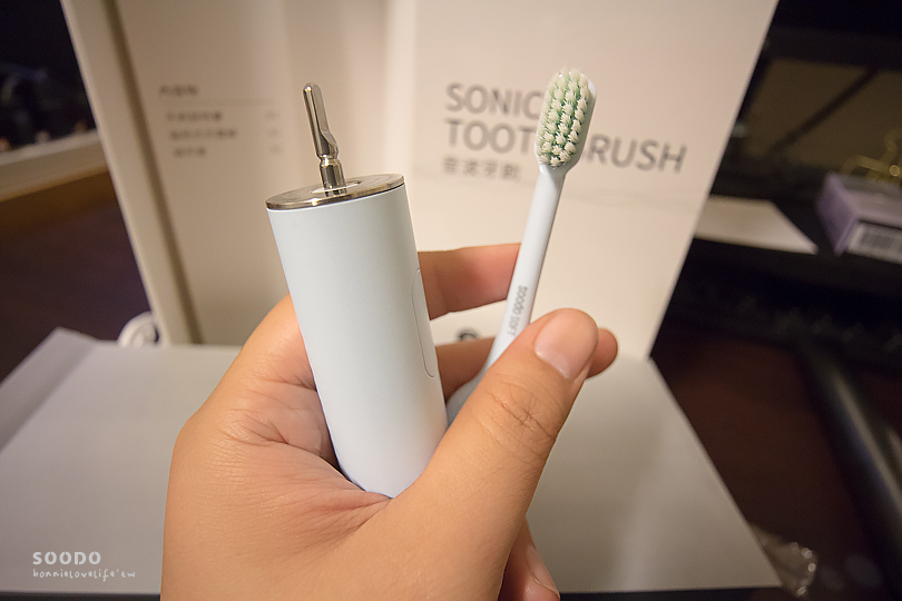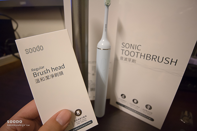 原機是柔羽呵護刷頭,你也可以另外購買溫和潔淨刷頭,兩個刷毛都是採用食品級 Tritan 彈性刷頭,什麼是 Tritan? Tritan 是美國 Eastman 公司所研發之塑料材質,不含環境賀爾蒙-雙酚A(BPA)。「SOODO音波電動牙刷」非常小,主要原因就是讓你可以刷到平常不容易刷到的地方,很多人的臼齒都會蛀牙,大部分主要的原因就是因為沒有刷到,這時候小刷頭的牙刷就非常好用!