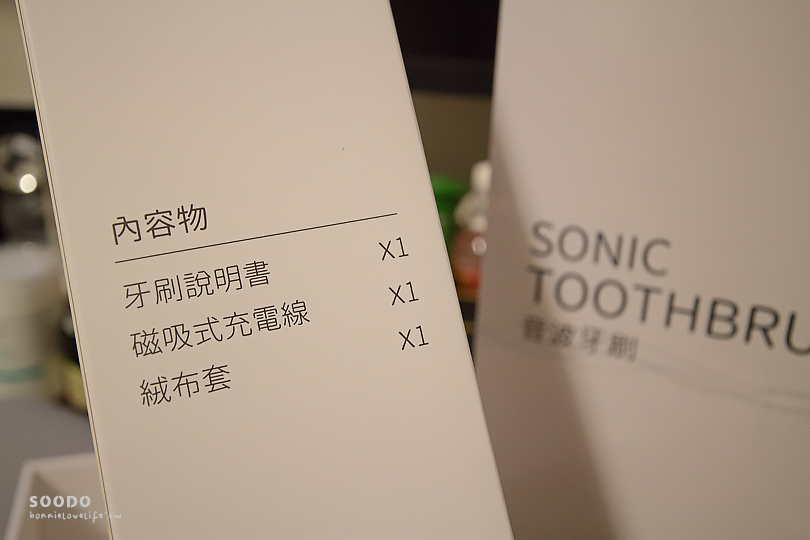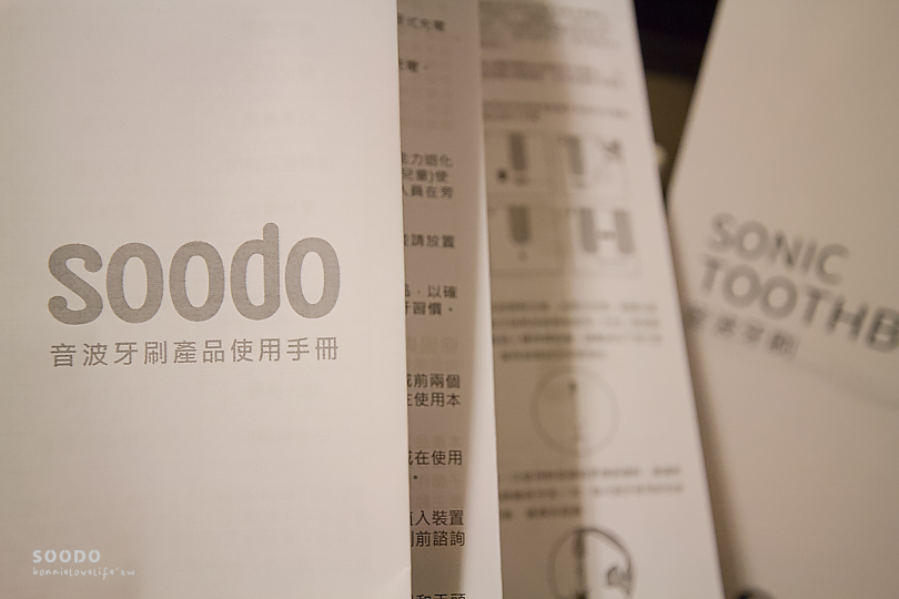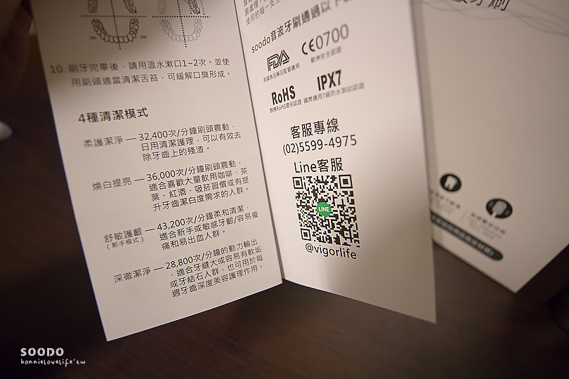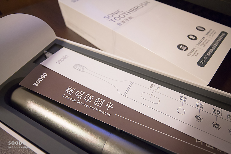盒內有一層印上 Soodo 的霧面紙,掀開後還有一張簡易說明書和產品保固卡,產品保固卡有附上「SOODO音波電動牙刷」的 QR Code 以及 Serial No,不用怕買到仿製品喔!