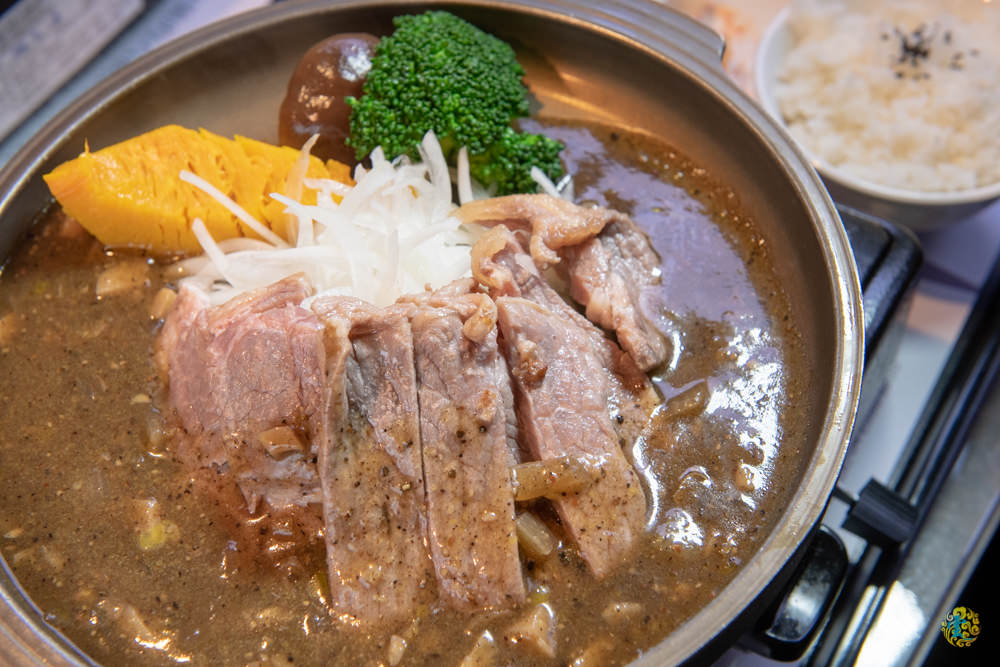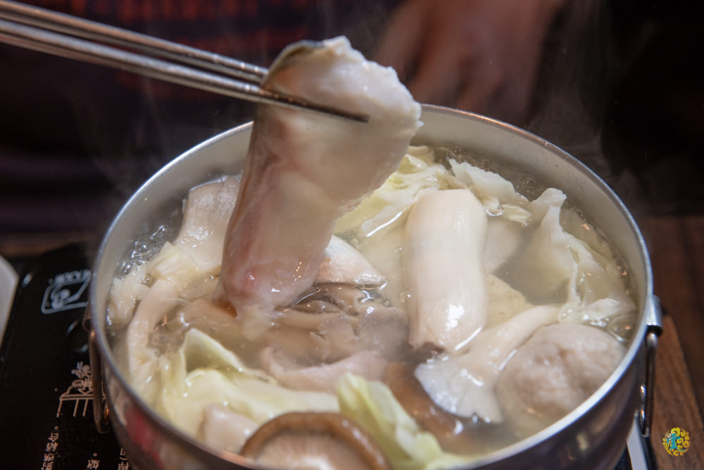 主菜有鱘龍魚片與鱘龍魚骨,魚骨先放入湯中熬煮,讓昆布湯頭多了鱘龍魚骨的甘醇鮮味,鱘龍魚片清涮幾下,變色後即可食用,一入口,鱘龍魚片的鮮味在嘴裡橫衝直撞,肉質鮮美Q彈偶而還會咬到脆脆的魚軟骨,很立體的口感。