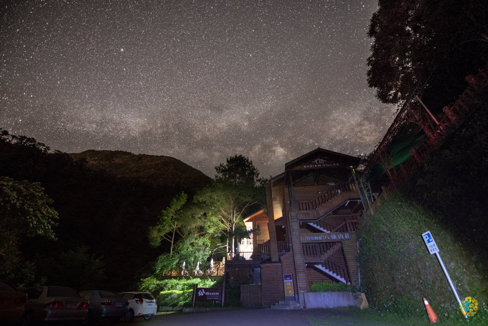 山莊人員表示,晚上八點之後漫森餐廳就沒有工作人員了,如果有任何問題一樣可以撥打房內註明的電話,還是會有山莊留守人員可以提供服務,而晚上十一點過後山莊所有的燈光都會關掉。凌雲算了一下今夜銀河升起地平線的時間,約莫十一點多,跟三五好友在小木屋內聊天看電視,享受貼近大自然的悠閒,不知不覺時間來到凌晨一點說。跟好友一起走出小木屋,享受夜晚的涼爽寧靜,抬頭仰望滿天星斗,由於毫無光害,星空清澈又清晰,真是個觀星的好地方。因為群山繚繞的關係,發現銀河的位置還有點低,散散步之後便回房休息,鬧鐘訂兩點多想出來再拍一次位置較佳的銀河,誰知醒來已清晨七點XD