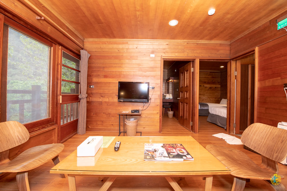 小木屋的前方有個小陽台,保有明亮的採光與美麗的風景,內部是一廳兩房一衛的設計,以楠木為空間主要建材,一進門就感受到那淡淡的原木香氣,透過單純的線條設計,流露出自然無壓力的氣息,營造自在慢活的居住氛圍。寬敞的客廳配有電視、小冰箱、空氣清淨機與茶具組,依舊保有適當的機能性。桌上還貼心的擺有中台灣相關的旅遊雜誌。電視不但配有第四台,而且台數相當完整,友人覺得這點非常好。