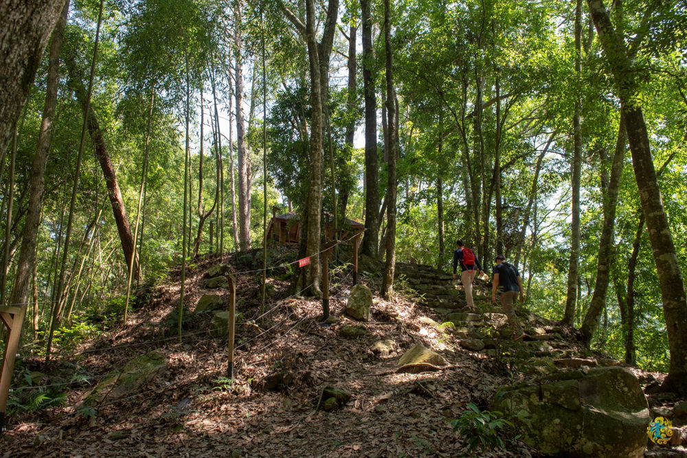 中途經過神社遺址,日治時期日本人在此建立一座小神社,後來因為戰火僅存基台,921地震過後就只剩地上兩個鳥居穴了,最後從原址重建尋悠亭以供乘涼與懷念。