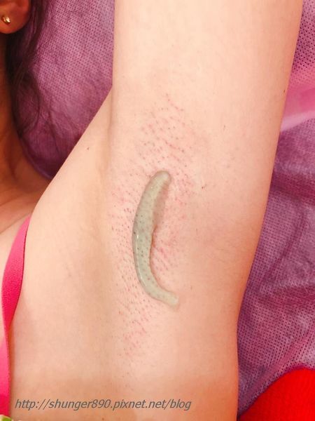 熱臘塗抹在肌膚上有點熱熱的,大約等候20-30秒,將凝固的臘撕起,腋毛瞬間連同被拔起,我算是蠻怕痛的人,覺得撕起來有點痛,痛感像是貼藥布撕起的感覺,但反覆兩三次後就很習慣了~