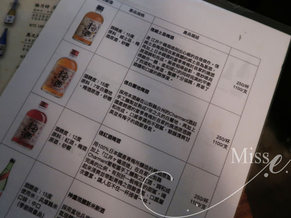 畢竟是居酒屋,當然也提供了非常多種類的日本酒!特別連梅酒都有白蘭地梅酒(NT$250)、威士忌梅酒及紅酒梅酒(NT$250)等口味,