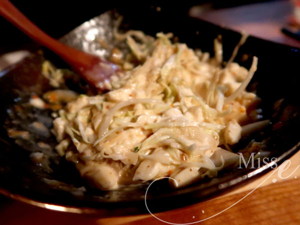 胡麻豆腐下方墊著清脆高麗菜絲,上面一坨坨紅色的是清爽嗆辣的辣椒泥,