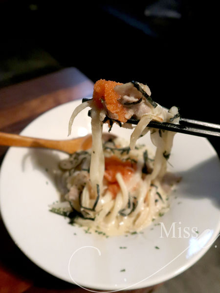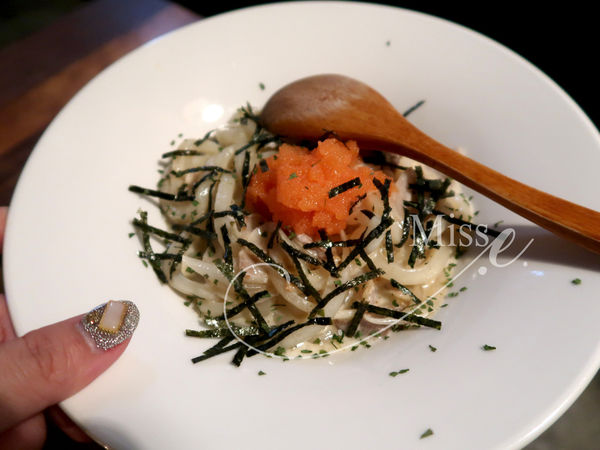 白醬和明太子真的是絕配,日式烏龍麵沾裹著奶油白醬,