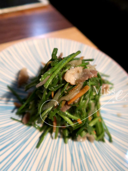 這道炒水蓮的清脆口感、清爽味覺可以刷新口中氣息,培根煸炒的煙燻氣息也讓調味更豐富。