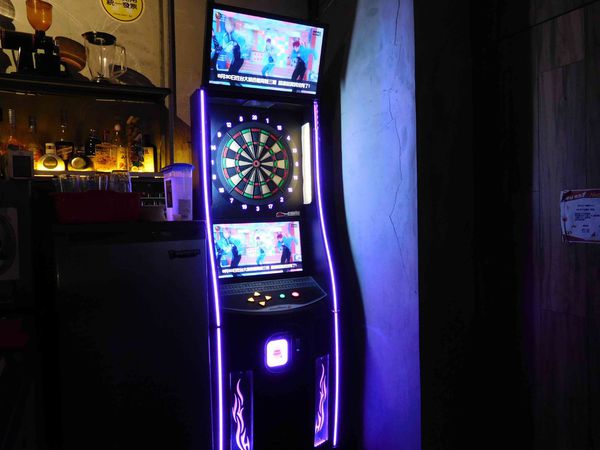 飛鏢機來啦 !! 飛鏢機的上方有著大型的電視 ,那時候正好播著世足賽^^