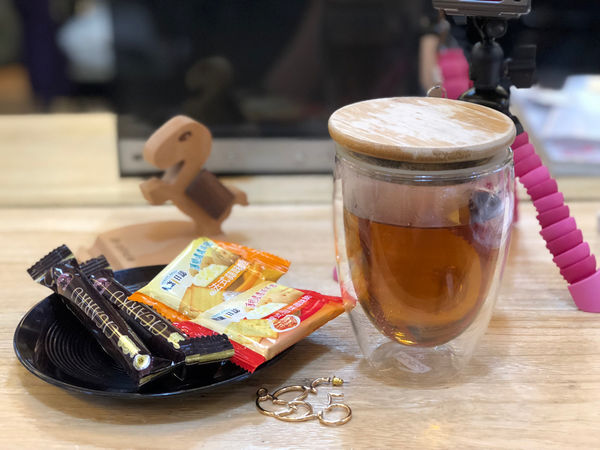 他有熱茶/奶茶/咖啡供選擇,還附上零食,巧克力捲心超好吃的拉