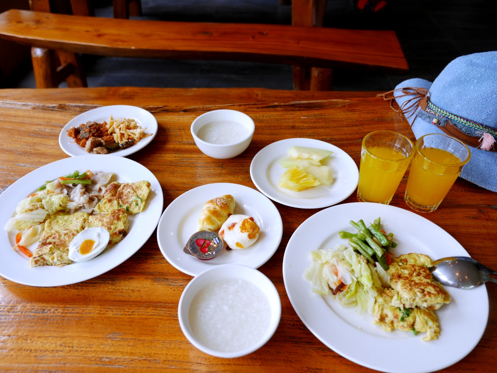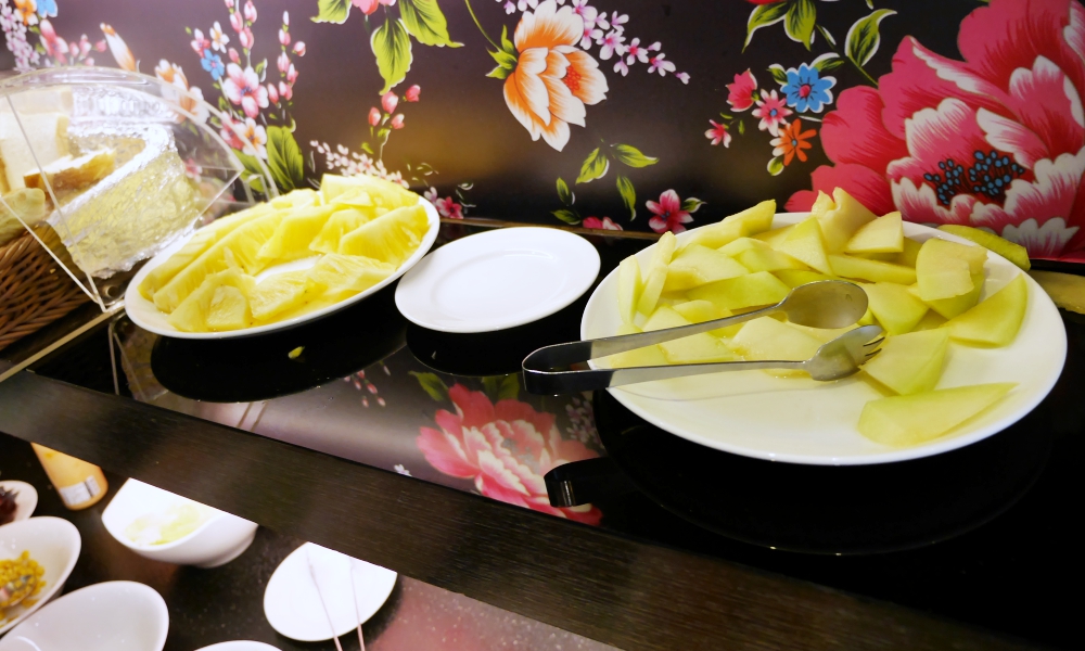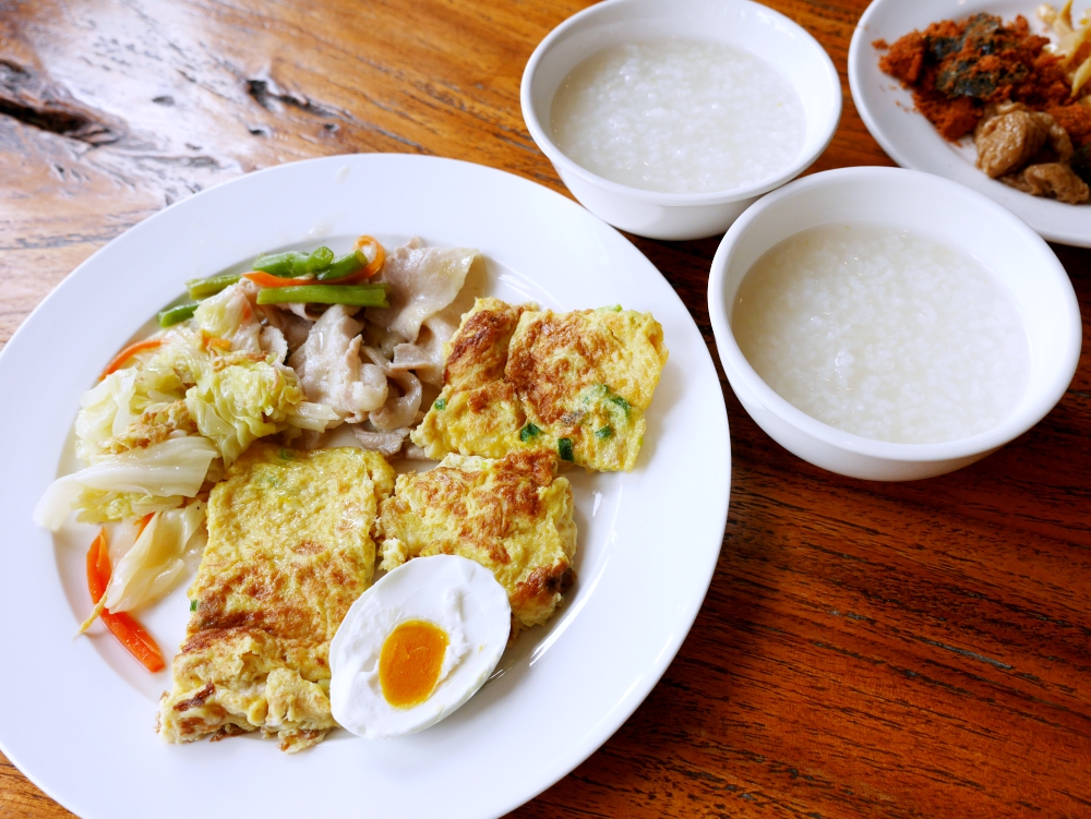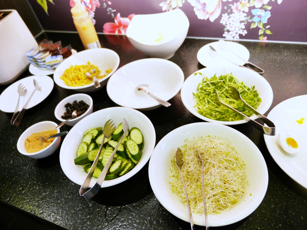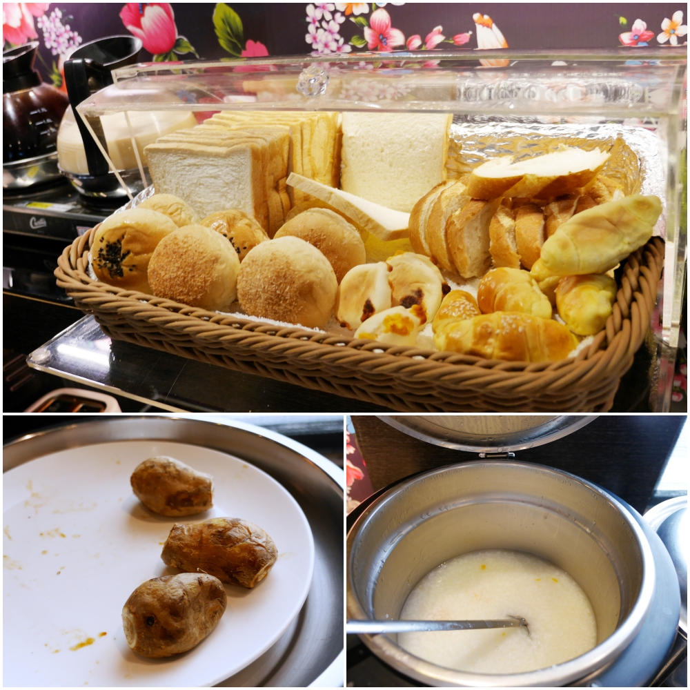 現炒熱食外有沙拉、果汁、水果、稀飯、滷肉、番薯、現烤麵包