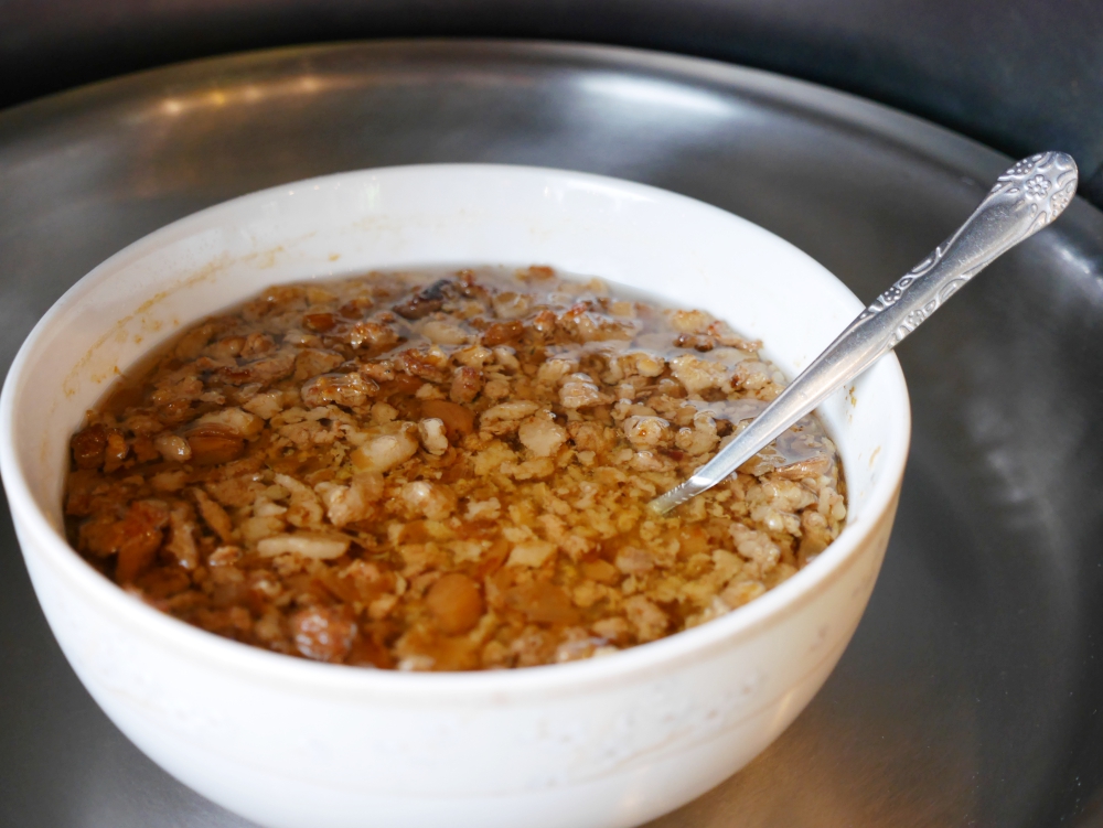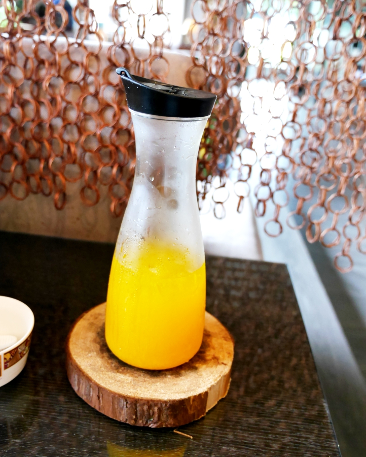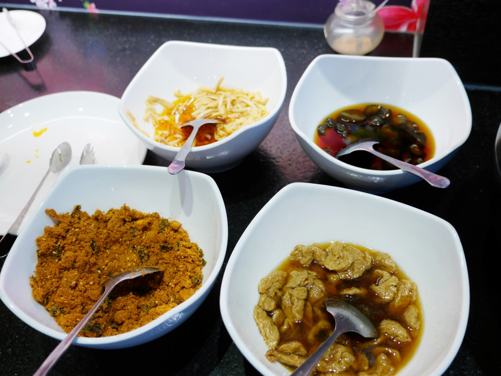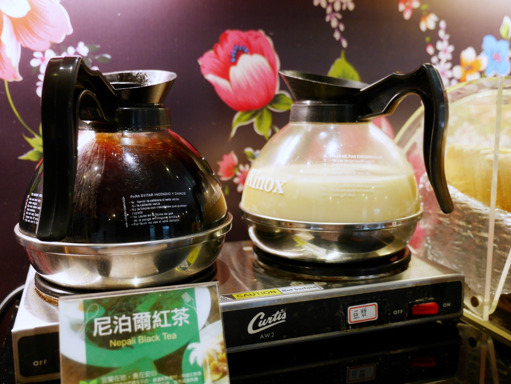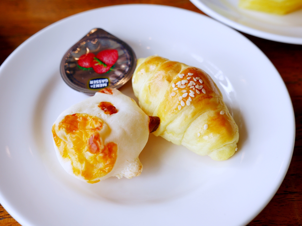 現炒熱食外有沙拉、果汁、水果、稀飯、滷肉、番薯、現烤麵包