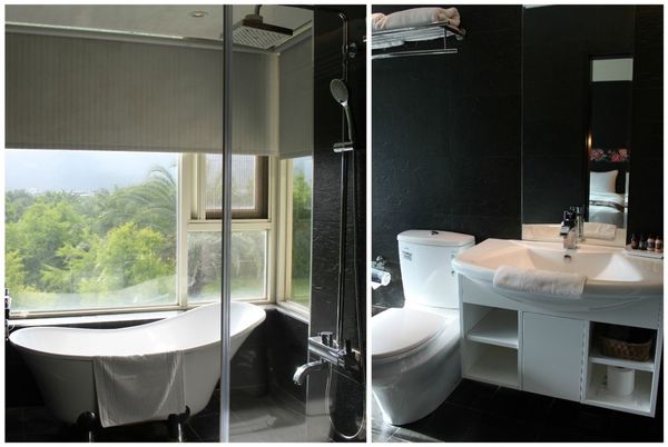 有淋浴也有浴缸,浴缸兩側也是透明大玻璃,可以邊洗身體邊洗眼睛。
