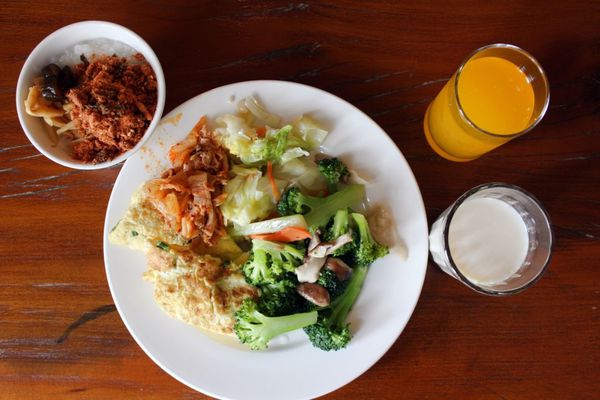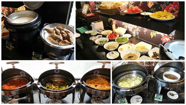 早餐有冰烤地瓜、白飯、地瓜粥及中式菜,也有西式生菜沙拉、烤土司、麵包及抹醬。