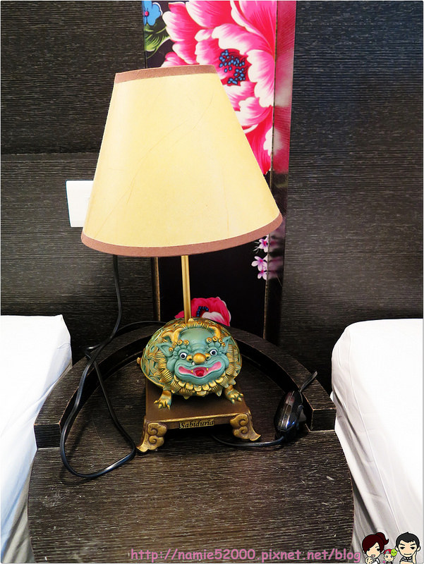 床上黑底的客家花布跟整體房間的日式風味非常的搭配