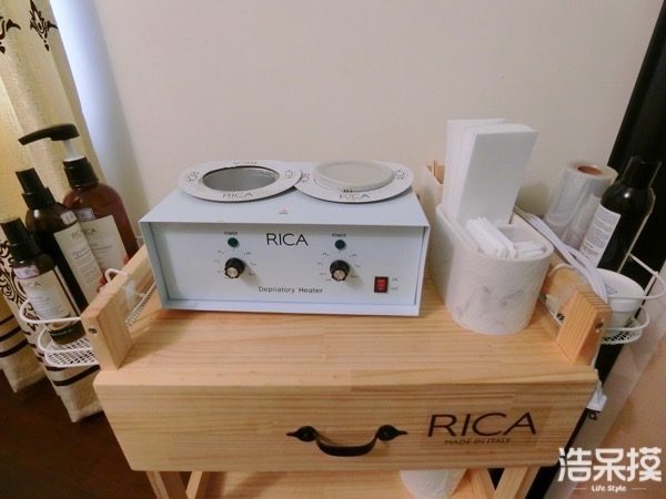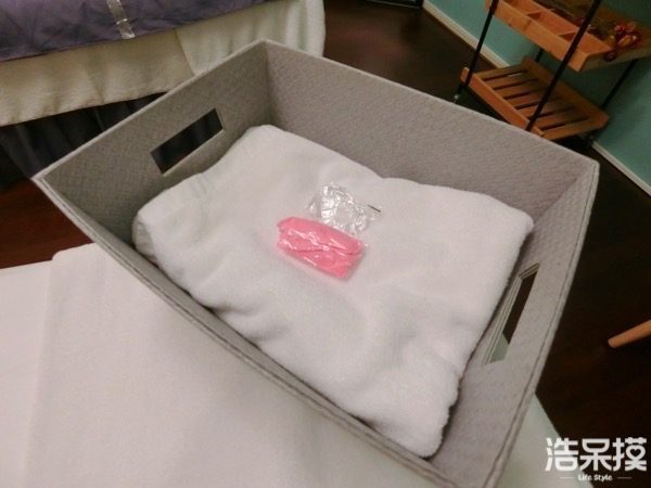在體雕服務開始前,美容師會提供一個更衣籃,內放有乾淨的浴巾、浴袍。在體雕前要先沖澡,沖澡後換上乾淨的浴袍後,可以先喝個茶,畢竟等等體雕一躺也是滿久的。而一旁的推車都放有體雕要使用的儀器與產品。