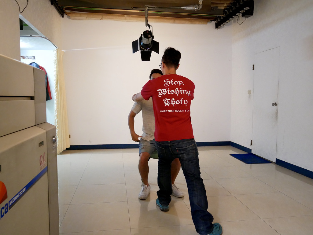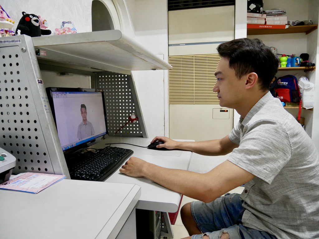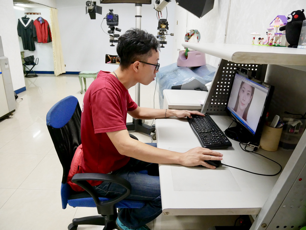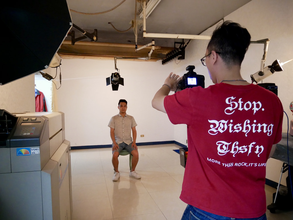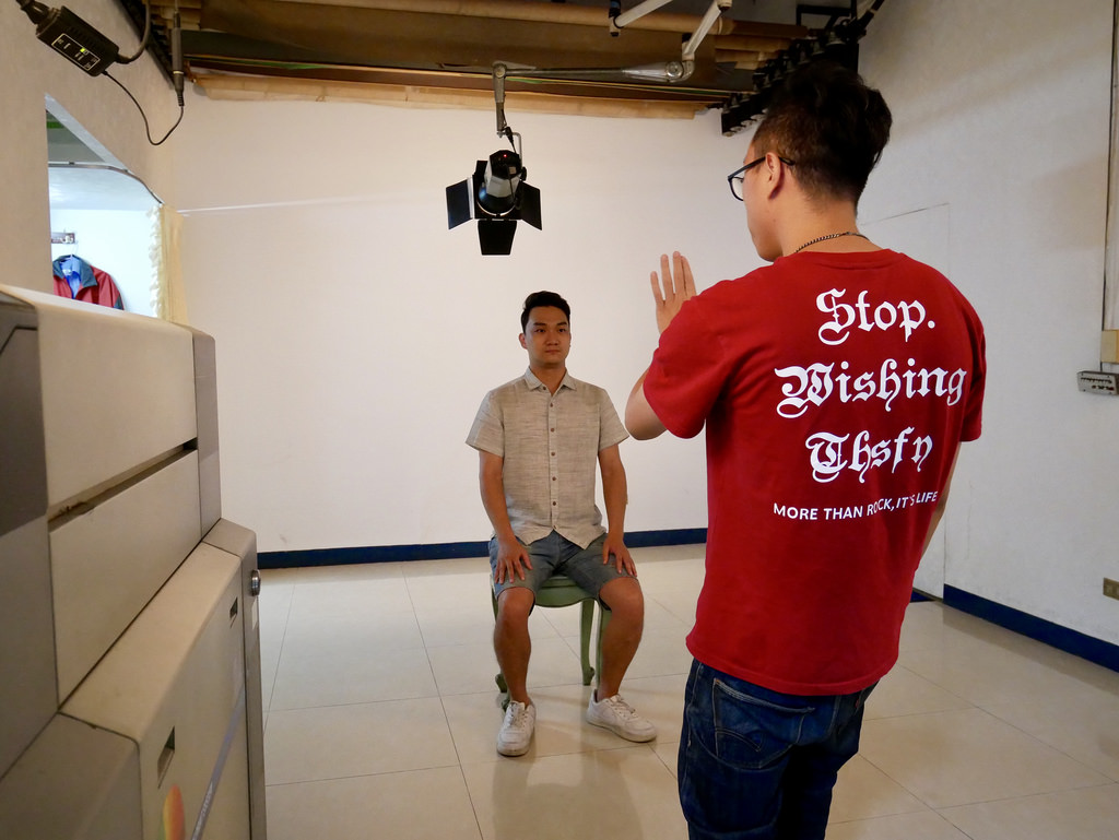 一開始他的臉有點僵僵的 , 老闆耐心的花了一些時間讓他放輕鬆才拍出好的大頭照